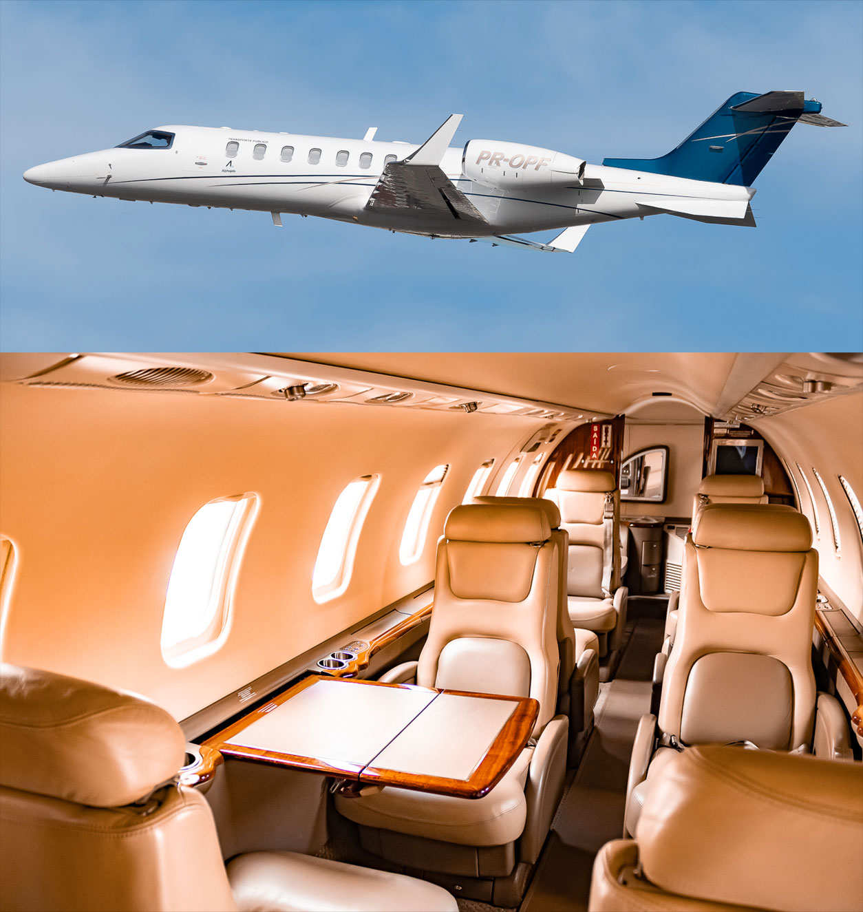 O Learjet 45XR é um jato bimotor de alta performance, com motorização turbofan e capacidade para transportar até 09 passageiros em viagens interestaduais e internacionais.