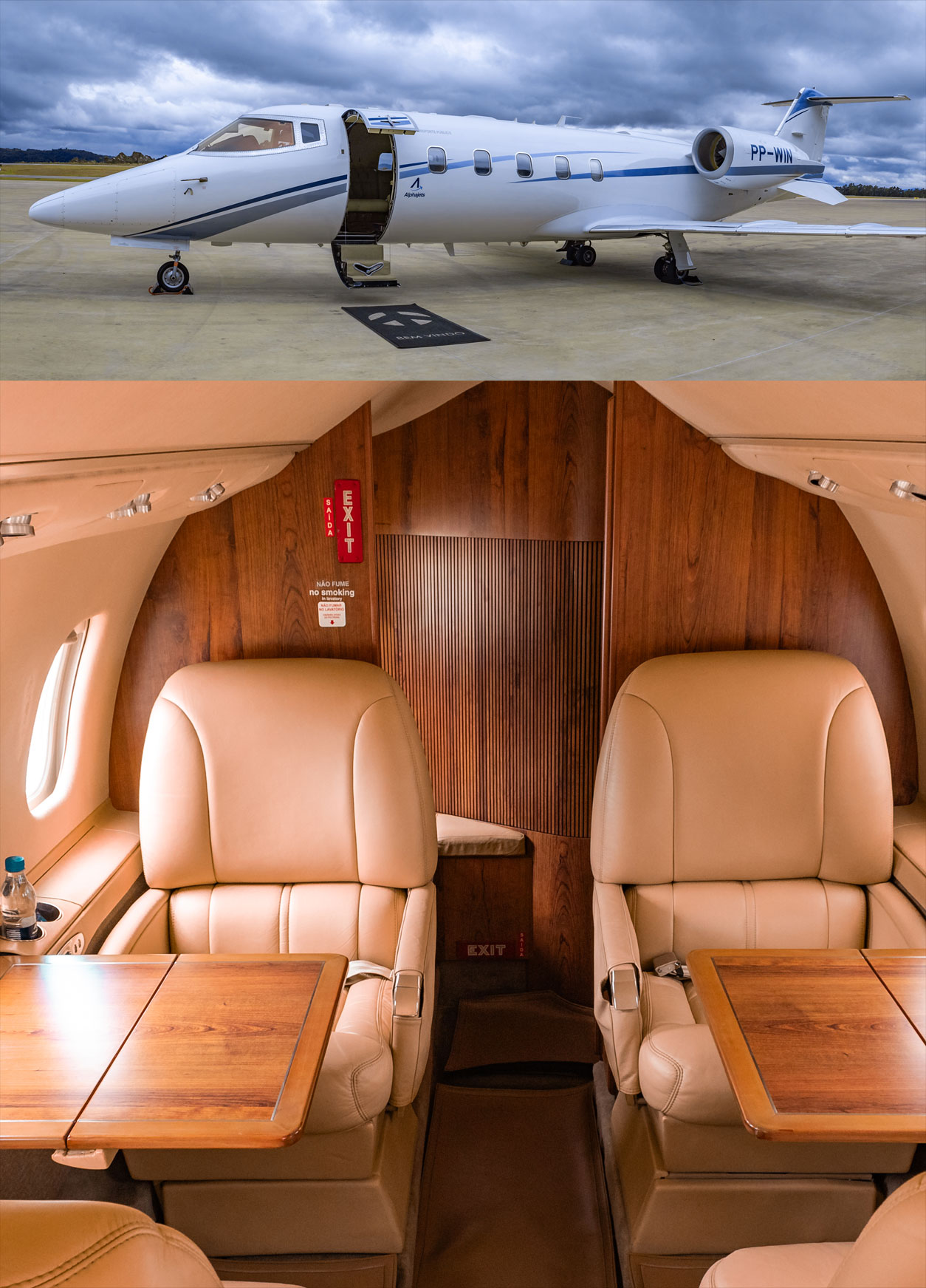 O Learjet 45 é um jato bimotor de alta performance, com motorização turbofan e capacidade para transportar até 09 passageiros em viagens interestaduais e internacionais.